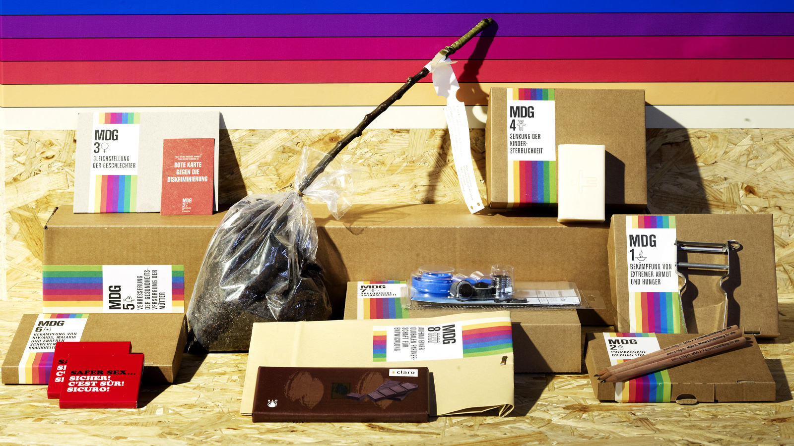 Die Szenografie des Standes erinnerte an einen Discounter. Und diente als «Bühne», um den Besucher*innen eigens für diesen Auftritt entwickelte Produkte übereichen zu können, die an die acht Milleniumsziele erinnerten. Ein spielerischer Ansatz, das übergeordnete Ziel – die globale Zukunftssicherung – im Alltag stets selbst vor Augen zu halten und sich für Themen wie Armutsbekämpfung, den Schutz der Umwelt oder die Menschenrechte einzusetzen.
