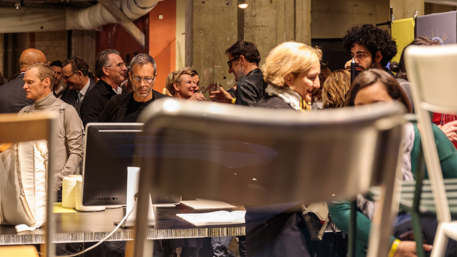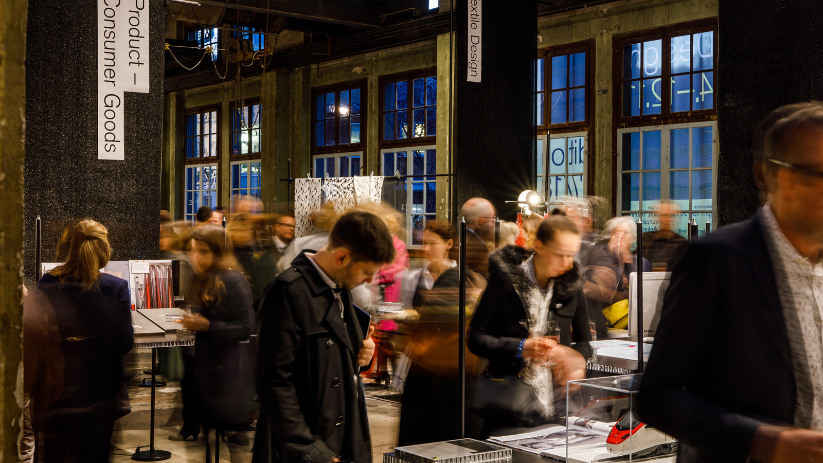 Besucher*innen an der Ausstellung über die nominierten Projekte 2017.